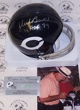 This Chicago Bears NFL Throwback 2-Bar Mini Helmet has been hand signed by Dick Butkus. Mr. Butkus added the HOF 79 Inscription. The helmet will include the photo of Dick Butkus signing and Certificate of Authenticity from Creative Sports Ent, Inc. with matching holograms on the helmet and certificate.